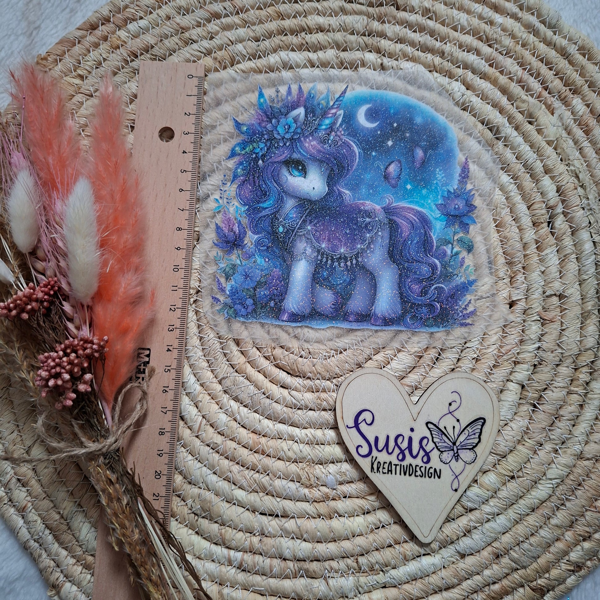 Bügelbild, Glitzer, Einhorn, Pfau, Nacht, lila